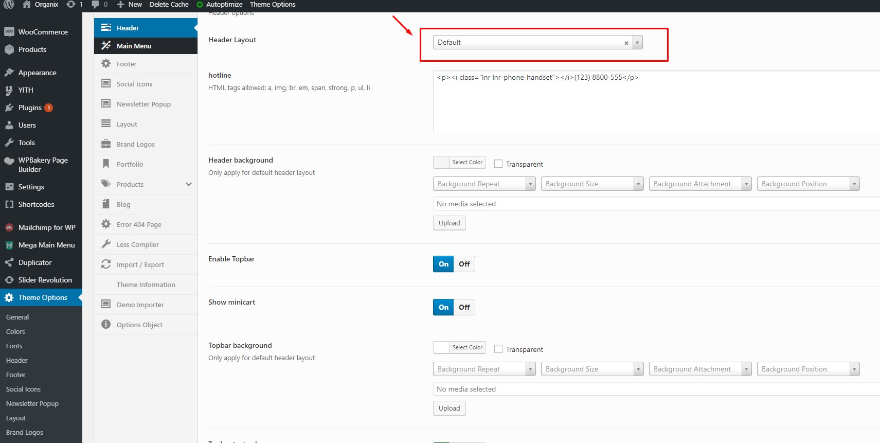 - Header:In this tab, we can select header layouts, there are 3 layouts of header. We can also change the mobile menu label, enter phone, email, select top menu ....
